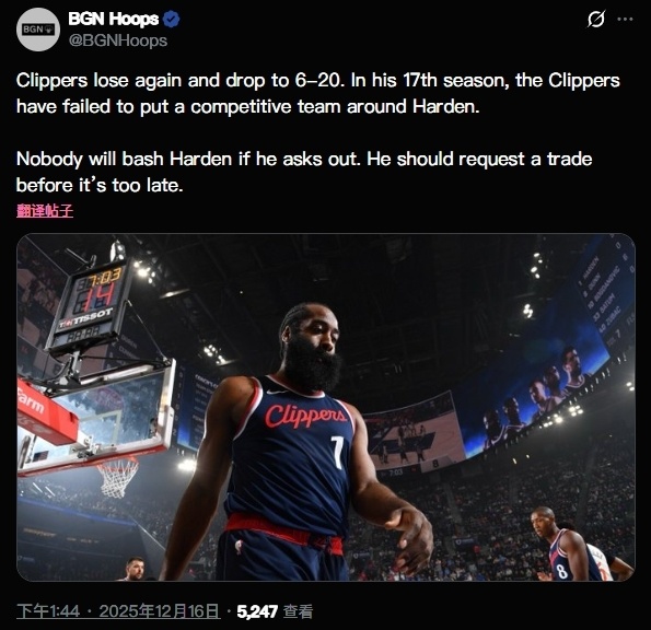 由于快船队成绩不理想,哈登深陷交易流言。对此,美媒BGNHoops发文建议哈登提出交易申请:“快船队又输了,战绩跌至6胜20负。在哈登的第17个赛季,快船队未能为他组建一支有竞争力的球队。如果哈登提出离队请求,没有人会责怪他。他应该尽早要求交易,以免为时过晚。 ”