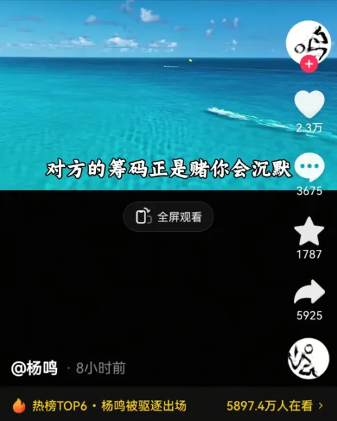 杨鸣转发视频的内容为:“你必须学会回击每一个不尊重你的人,遭遇欺压时不必害怕将事态扩大,对方的筹码正是赌你会沉默。沉默换不来理解,只能换来得寸进尺,你越是没脾气,别人越会对你苛刻,一次坚定的反击,就会有八成的几率会被尊重。亮出你的边界与锋芒,让他们看清挑衅的代价,那怕一次有力的回击,也足以宣告你并非弱者。你的底线越清晰,越是能逼退那些消耗你的人。”