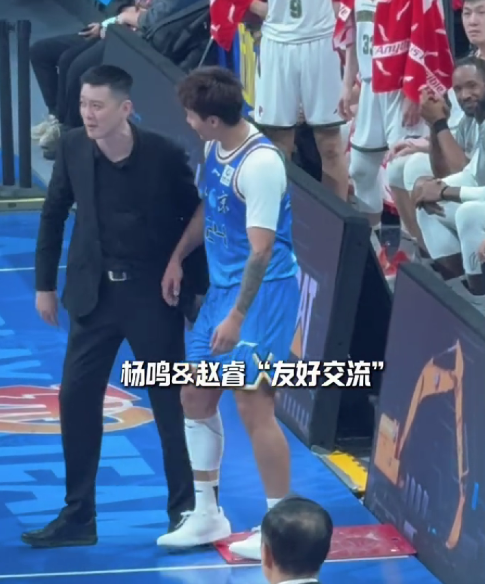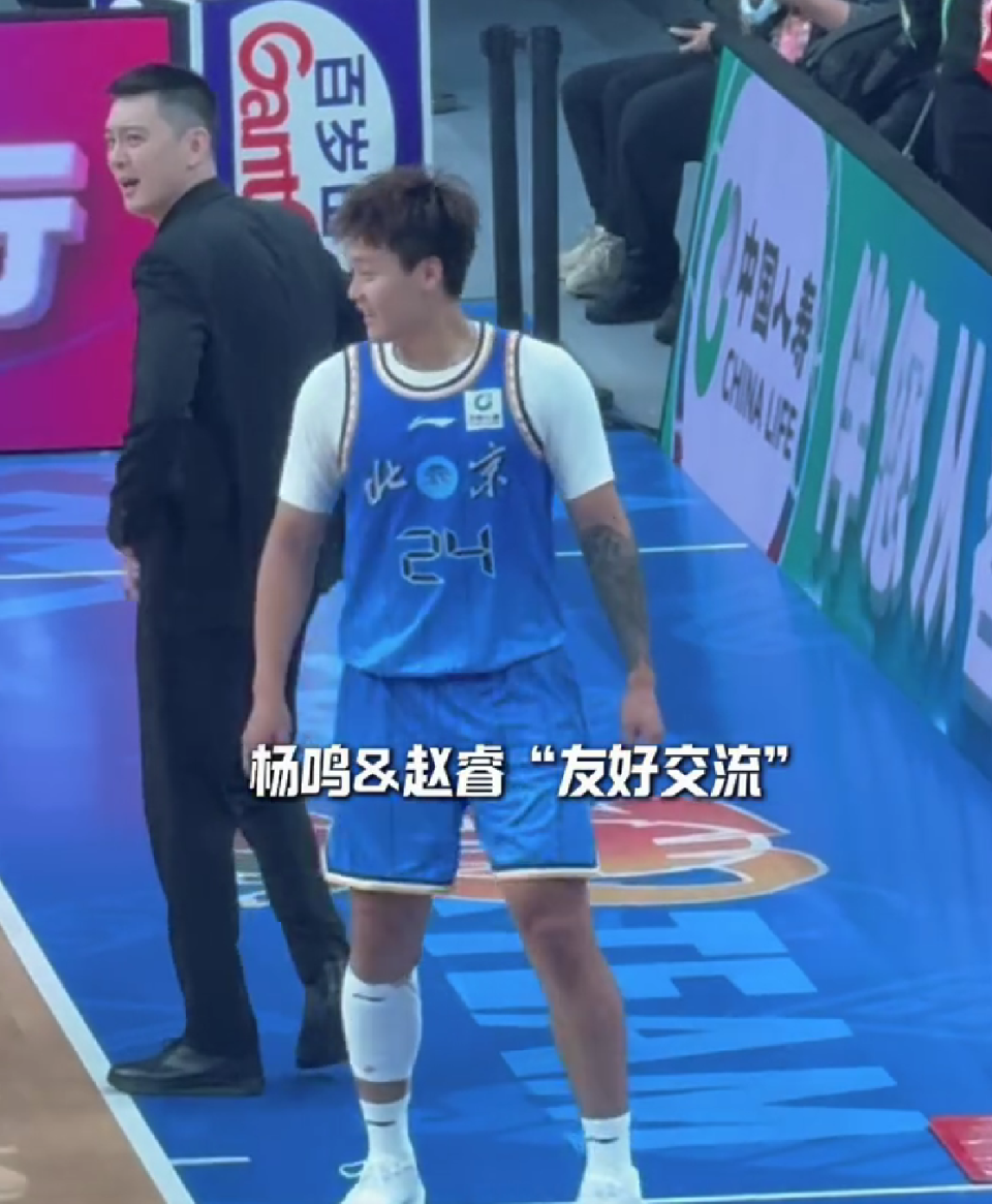 身为北京队球员的赵睿被杨鸣拉住后,从茫然无措到忍俊不禁,全程未附和或反驳,被网友调侃“低头看球衣确认阵营”。