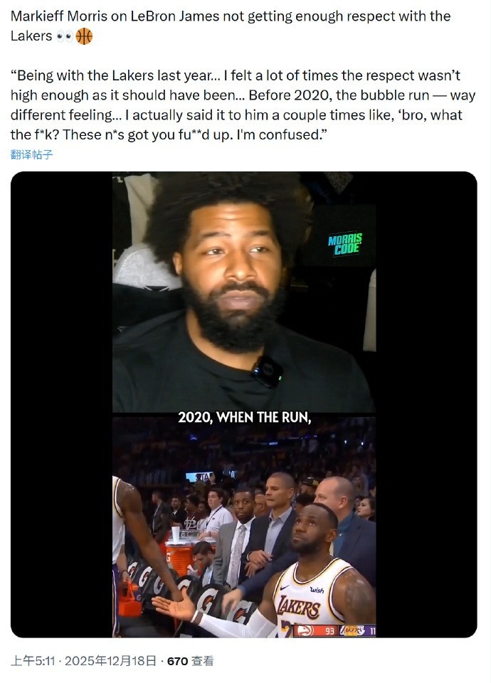 12月18日,前湖人球员马基夫·莫里斯在播客节目中谈到了去年的湖人:“在湖人的上个赛季,我感觉很多时候对勒布朗的尊重并没有达到应有的程度。我可以这么说,在2020年园区复赛期间的感觉不同,完全不一样。如今,你湖人确实得到了卢卡,但我就是觉得尊重程度不够。我甚至好几次对勒布朗说,‘兄弟,这是怎么回事?这些人把你搞得很惨,我感到很困惑。’”
