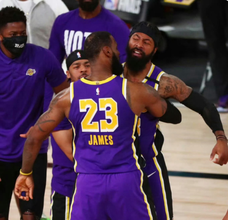詹姆斯和大莫里斯都是湖人2019-20夺冠赛季的冠军成员,当时在封闭园区内比赛,湖人夺得了园区总冠军。