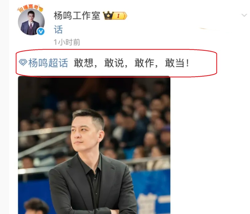 更为有意思的是,在刚刚,杨鸣工作室还有一则霸气发文:敢想,敢说,敢做,敢当!