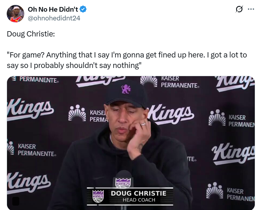 国王主帅克里斯蒂赛后表示:“我本想说些什么,但说什么都肯定会被罚款,所以还是不说了吧。”