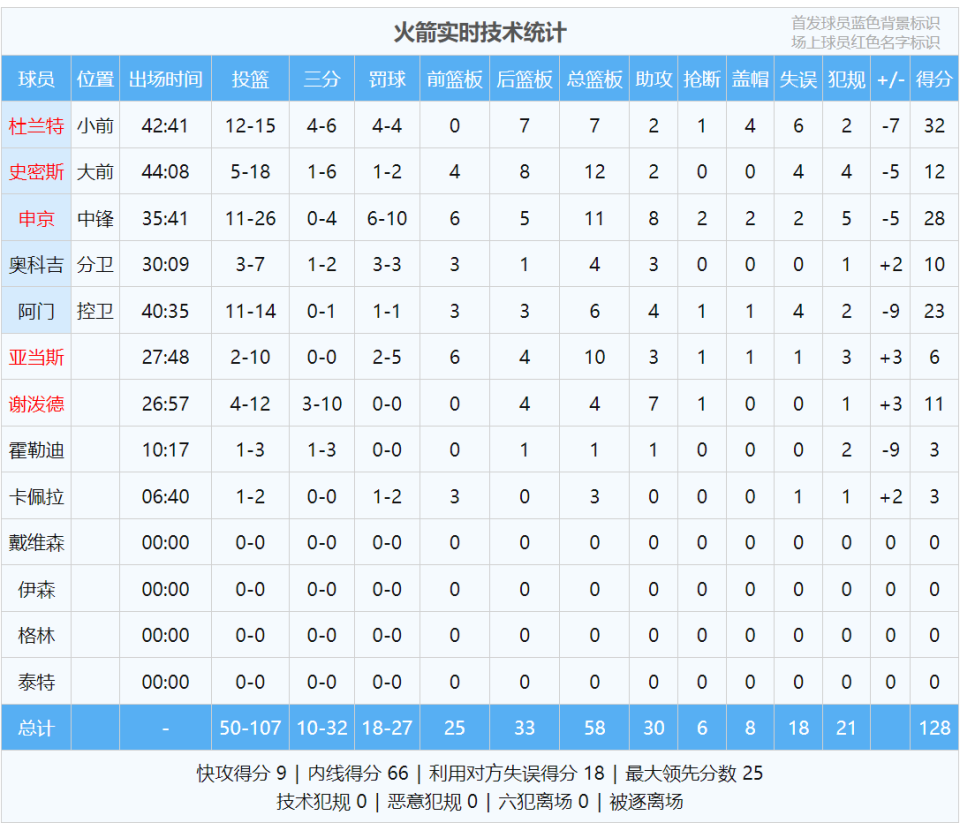 跟上一场打掘金同样的剧情,关键时刻申京太吃球权了,杜兰特几乎拿不到球。此役杜兰特打了42分41秒,15投12中空砍32分7篮板2助攻1抢断4盖帽6失误。阿门14中11砍下23分,他跟杜兰特合计29中23,投篮命中率79.3%。