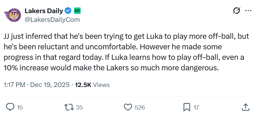 在冲击MVP的同时,东契奇也在为球队做出改变与牺牲,正如湖人自媒体Lakers Daily所说,雷迪克不止一次通过公开采访暗示东契奇要打更多的无球,但后者一直不太情愿,本场他却在这方面做得不错,如果他愿意增加更多的无球跑动,哪怕是10%的提升,湖人的进攻也会更具威胁。