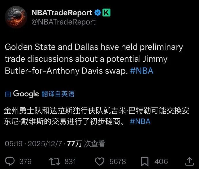 据美媒报道,勇士和独行侠可能就巴特勒(本赛季薪资5413万美元)与浓眉哥(5413万美元)互换东家的交易进行了初步磋商。