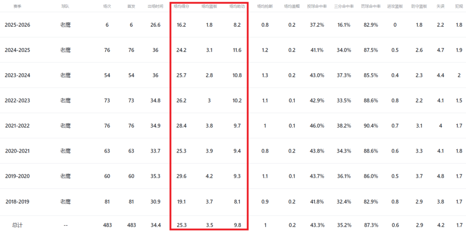 27岁的特雷杨,二年级就能场均29.6分9.3助,三年级便可以带领老鹰杀进东决,22-25连续三个赛季场均两双进账,上赛季更是以场均11.6助当选为联盟助攻王,实力还是相当突出的持球大核,会有球队愿意提供顶薪将他收入麾下。