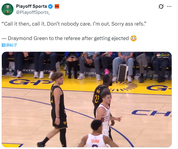 第二节比赛打到10分多钟,追梦在内线大帽吉莱斯皮,库里持球反击命中追身三分还造犯规,岂料追梦与吉莱斯皮发生冲突,两人吵着吵着,追梦突然动手,怒推吉莱斯皮吃到技术犯规,随后挑衅裁判再要技犯,结果裁判又给他一个技犯,追梦连吃两T被驱逐离场,离场前他继续狂骂裁判。