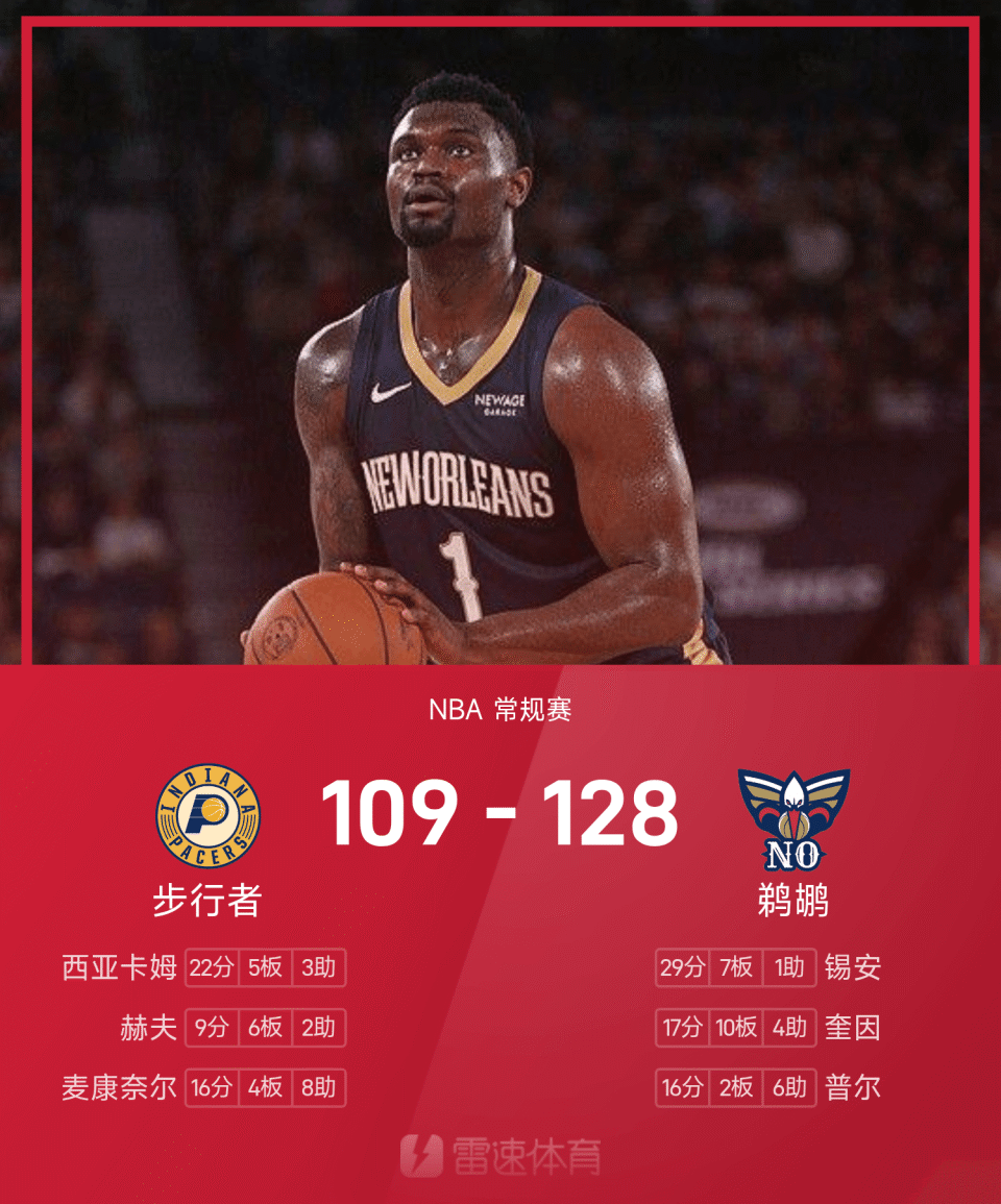 锡安复出贡献29分7板1助攻,球队升至西部第14。