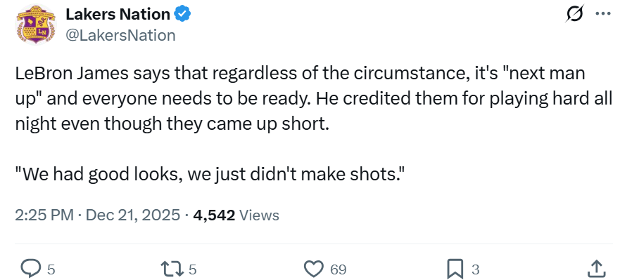 面对詹姆斯这样的表现,湖人媒体Lakers Daily称赞道:“詹姆斯本赛季首次出手20+就轰下36分,正如他此前自己所说,只要他愿意,他每晚依旧可以做到这一点。”