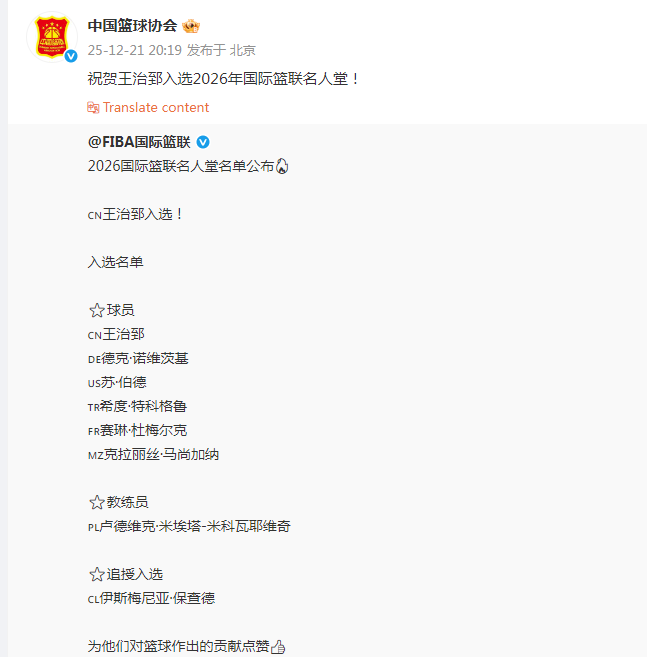 为此,中国篮协也特意恭喜王治郅:“祝贺王治郅入选2026年国际篮联名人堂!”