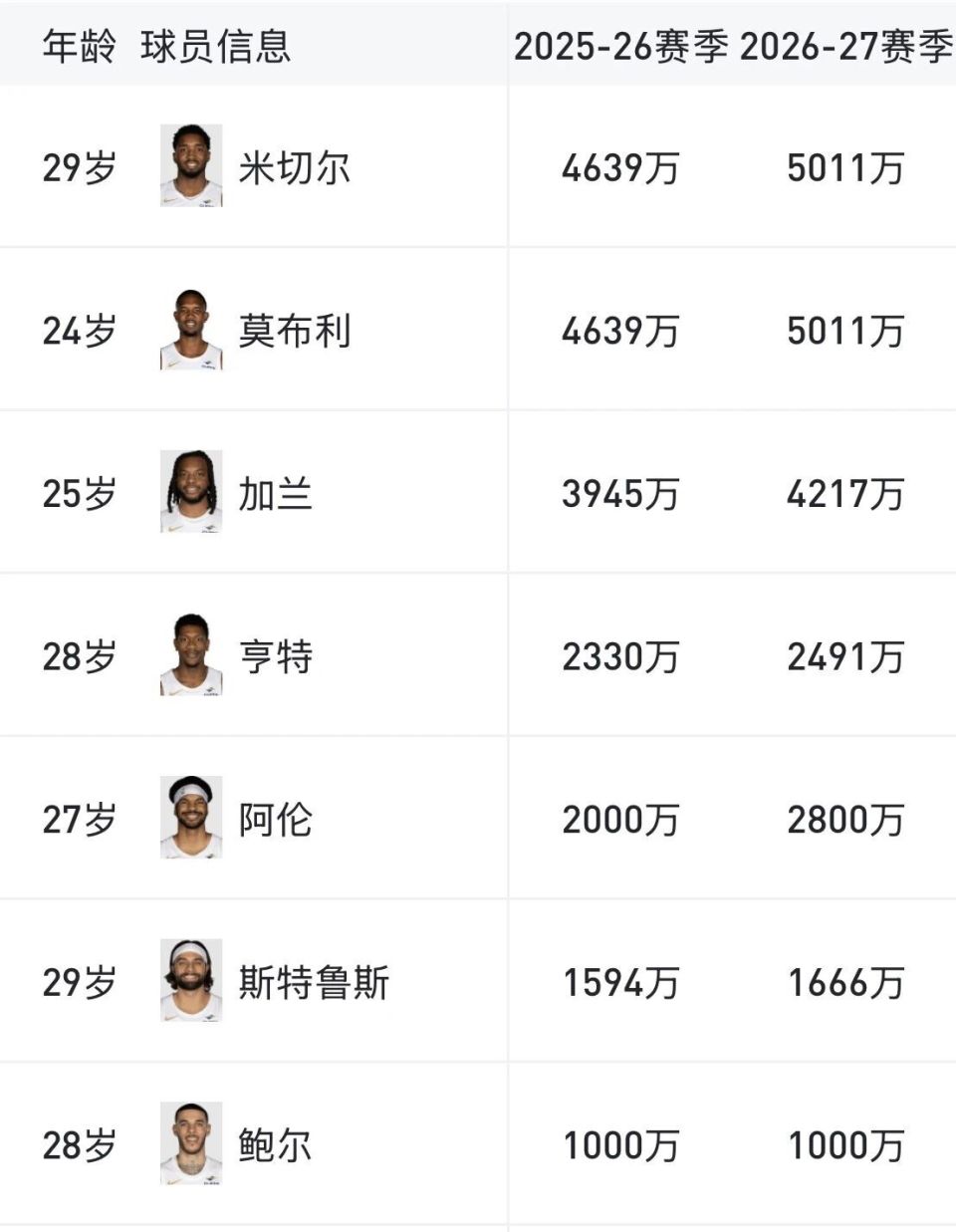 加兰的合同5年1.93亿美元,2028年夏天到期。米切尔的合同3年1.5亿美元,同样是2028年夏天到期。莫布利5年2.69亿美元,2029年夏天到期。阿伦3年9100万美元,2029年夏天到期。亨特4年9000万美元,2027年夏天到期。