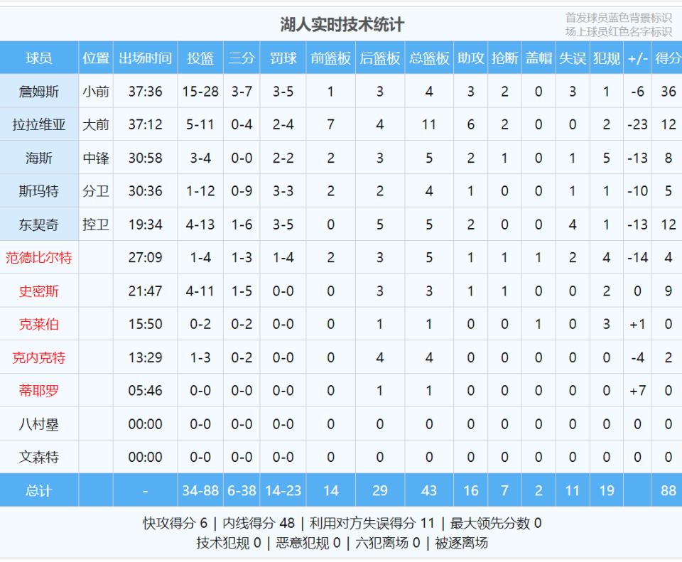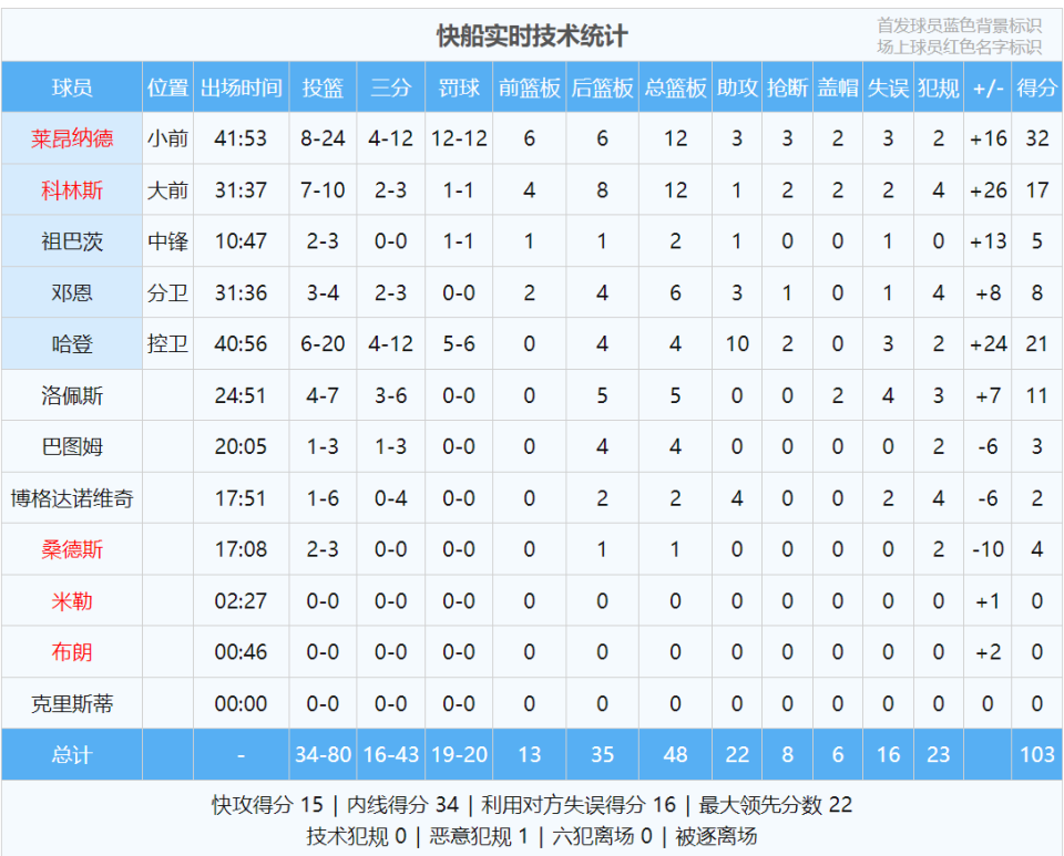 伦纳德32分12板3助3断2帽、哈登21分4板10助2断、科林斯17分12板!詹姆斯28投15中,空砍36分4篮板3助攻2抢断,得分创造个人赛季新高。40岁356天的詹姆斯超越诺维斯基,成为NBA最老砍下30+的球员。最后看看数据: