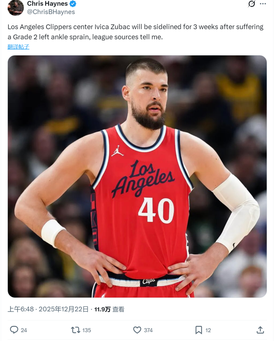 北京时间12月22日凌晨,据NBA名记Chris Haynes报道:快船中锋祖巴茨遭遇左脚踝二级扭伤,将在3周之后接受重新评估。也就是说,祖巴茨至少要缺席10场比赛。快船刚刚结束5连败、逃离西部倒数第一,如今内线擎天柱倒下了。