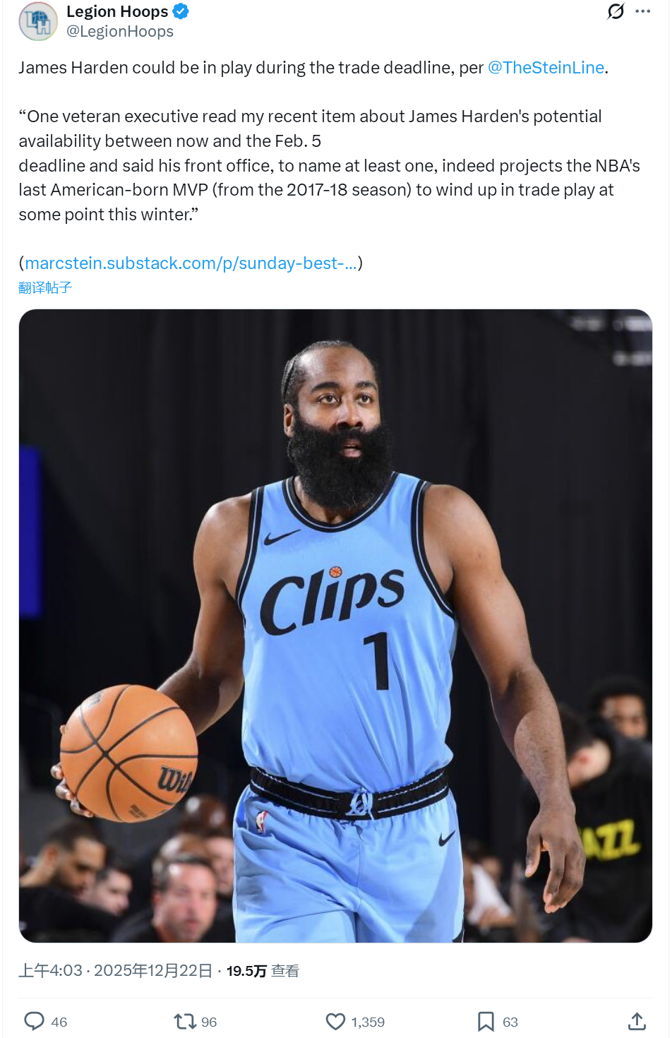 同样是今天,另一记者Marc Stein报道,随着2月6日的交易截止日临近,哈登正在越来越多地被联盟球队高管提及为潜在交易筹码。越来越多的高管认为,哈登将在今年冬天进入交易市场。祖巴茨养伤这段时间,快船大概率要解体了。