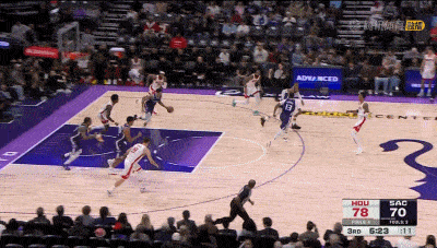 次节比赛,史密斯三分命中,阿门上篮得手,杜兰特跳投连中扩大领先。国王迅速回应,雷诺上篮命中,施罗德快攻上篮得分,克利福德两分跳投命中紧咬比分。伊森和谢泼德连续命中三分!国王队德罗赞两分跳投、三分命中连追分数,申京多次突破扣篮和空切上篮得分,杜兰特命中三分,穆雷突破上篮得分,申京两罚全中,威少命中三分。随后阿门完成暴扣,谢泼德造成压哨犯规三罚全中,火箭队68-57领先国王队结束上半场。