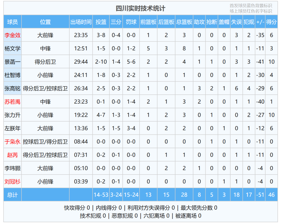 从本场比赛来看,四川队在第一节比赛只得了10分,然而,到了第二节比赛,更是只得了6分。就这样,整个上半场比赛,四川队一共是拿到了16分,这也是创造了CBA最低的半场得分。
