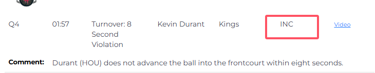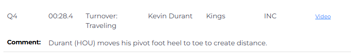 第一次漏判发生在末节还剩1分57秒,裁判报告指出,杜兰特未在8秒内从后场运球过半场,这应该吹罚杜兰特8秒违例,国王吃亏。