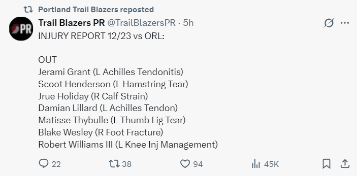 格兰特(左跟腱炎)、亨德森(左腿肌肉撕裂)、霍勒迪(右小腿拉伤)、利拉德(左跟腱)、塞布尔(左拇指韧带撕裂)韦斯利(右脚骨折)、罗威(左膝盖伤势管理)都伤缺。