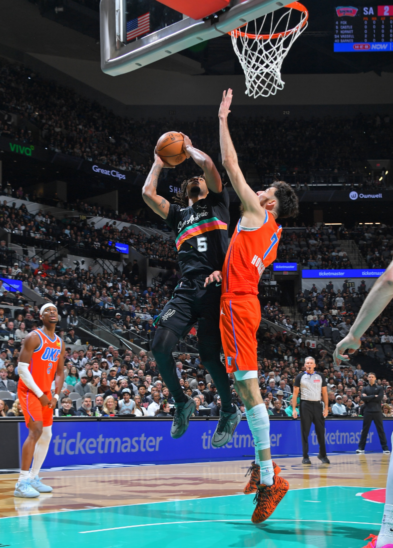 两队拼防守拼的很厉害,文班亚马在场上都没有太多的机会,上半场文班亚马只拿到7分,SGA在第二节是大爆发8中5拿到11分1篮板2助攻,半场打完SGA拿到16分,马刺这边则是多点开花,卡斯尔、瓦塞尔、巴恩斯、凯尔登发挥都比文班亚马还好。