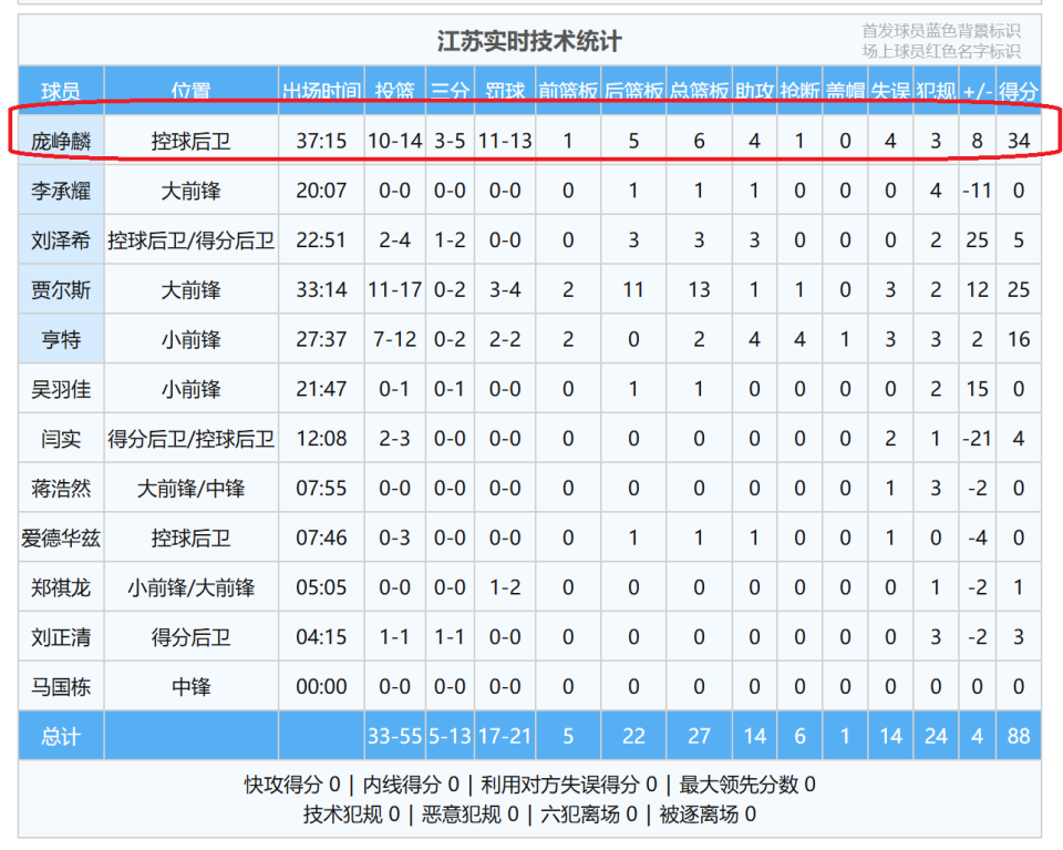 全场比赛,庞峥麟一共打了37分钟,投篮14中10,命中率达到了71.4%,其中,三分球5投3中,罚球13中11,砍下了34分6篮板4助攻1抢断!其中,34分也是继续刷新了他CBA职业生涯的得分 新高,在此前,他面对上海队的时候,砍下了32分。