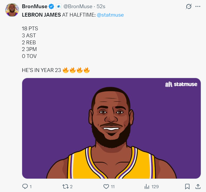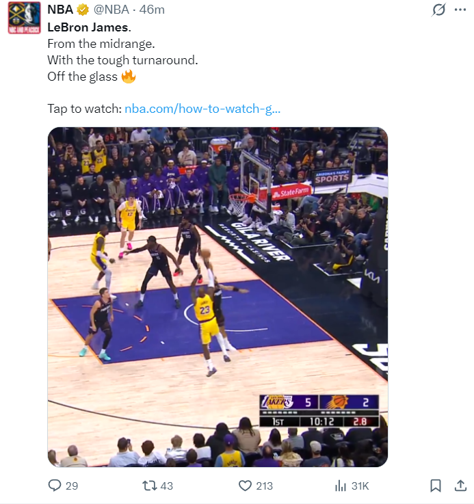 第二节太阳两次拉开到13分都是詹姆斯的三分球去续命,他多次冲击篮下造犯规但罚球的效率很低,单节7中4,三分3中2,罚球9中4,拿到14分2篮板,半场詹姆斯18分3助攻2篮板0失误,湖人还是落后10分之多。