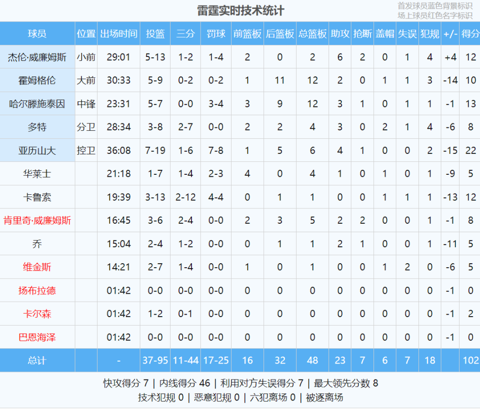 亚历山大投篮19中7,三分6中1,罚球8中7,得到22分6板4助,正负值-15全场最低。本赛季前三场失利,雷霆一共只输了9分。两天前雷霆输给马刺20分,今天又输了15分。这是雷霆自2021-22赛季以来,首次连续两场输分15+!