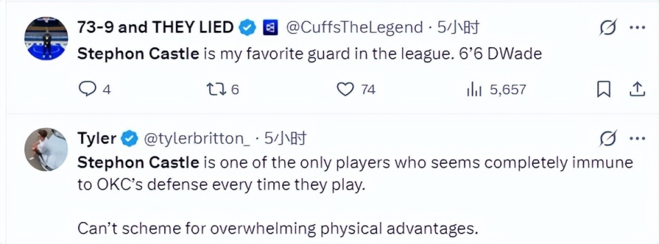 都说雷霆的外线防守属于联盟顶级水平,云集多位3D悍将。但是,卡斯尔似乎做到了可以无视雷霆的外线防守。他还只是一位二年级球员!不得不令人感叹,卡斯尔有出色的运动天赋,也拥有很高的球商以及出色的技术。美国自媒体73-9 and THEY LIED特别夸奖了卡斯尔:“卡斯尔是我最喜欢的后卫,1米98版德韦恩·韦德。”