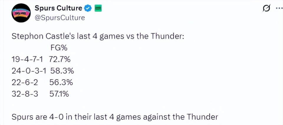 马刺球员的运动能力很强,退防速度足够快,亚历山大也无法像过去那样利用快攻取分。不得不说,亚历山大面对马刺很难处在自己的节奏,打得非常别扭。卡斯尔无疑是马刺限制住亚历山大的头号功臣。