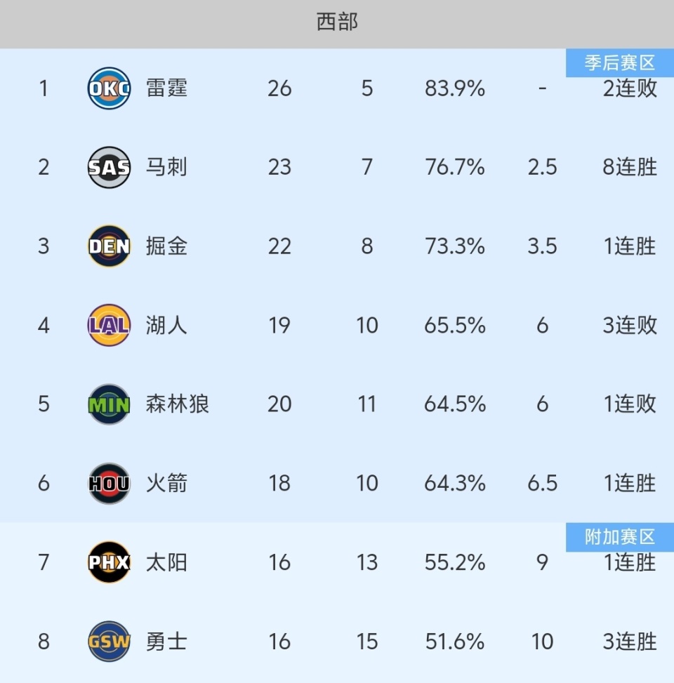 马刺把雷霆拉下了神坛,雷霆赛季初很猛,一度有种终结全联盟的态势,但是马刺成了雷霆克星,他们已经连赢雷霆3场,而且未来两队再次碰到,雷霆也不好打,马刺每个位置都能和雷霆对上,而且有点有过之而无不及的架势,西部真的变天了,前6现在乱成一团糟,整体的竞争越来越好看了!