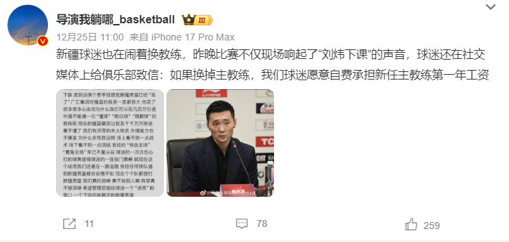 新疆主场不敌青岛后,很多球迷都在高呼刘炜下课,甚至有球迷给俱乐部写信解雇刘炜,球迷愿意承担刘炜一年的薪水。青岛客场VS新疆的21连败被终结。