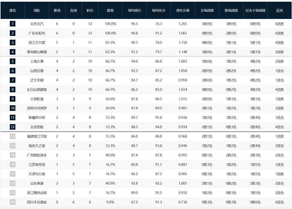 CBA积分榜:北京、广东皆6连胜+天津首胜,山东、浙江排名靠后