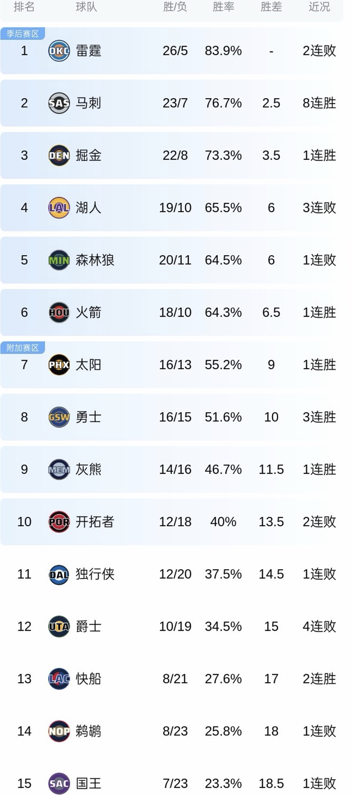 随着掘金142-138胜森林狼,湖人3连败,NBA西部排名:第2-6名差4个胜场