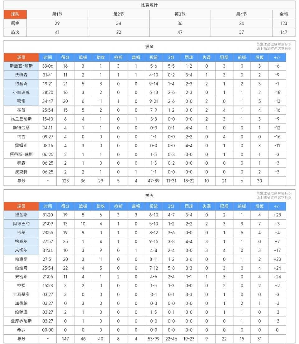 但是下半场一上来,掘金队并没有约基奇的身影了,他因伤退出了比赛,这对掘金来说就等于是擎天柱没有了,结果掘金队崩盘得非常快,热火第三节上来就打出了强势的碾压局,掘金防守端完全被打爆,进攻端火力也续不上了,没有了约基奇,贾马尔穆雷完全带不动,他自己也陷入了打铁模式,三节战罢掘金落后到了两位数,末节热火先打出一波高潮,掘金大势已去,最终输掉了比赛!