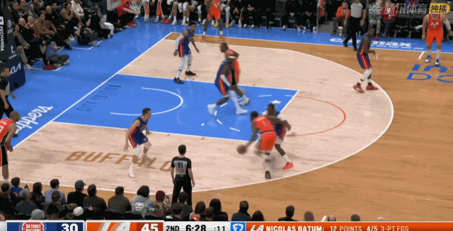 看这个回合,哈登与大洛佩斯挡拆,后者外切牵制防守,哈登如入无人之境中路突破撕开防线,找到了左侧侧翼的巴图姆。