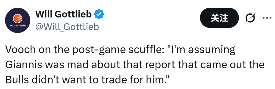 公牛中锋武切维奇赛后则向记者表示:“我猜扬尼斯是因为看到有报道称公牛队无意通过交易得到他而生气。”