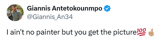 北京时间12月28日,雄鹿球星字母哥更新社媒,晒出了自己在垃圾时间扣篮的照片,并配文写道:“我表达能力有限,但你应该明白我的意思。”