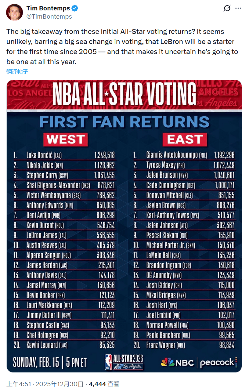 北京时间12月30日,NBA常规赛继续进行。在今天早些时候,NBA官方公布了2026年全明星球迷投票首轮结果。其中,詹姆斯的排名不容乐观,著名记者Tim Bontemps直言詹姆斯有落选的可能性。