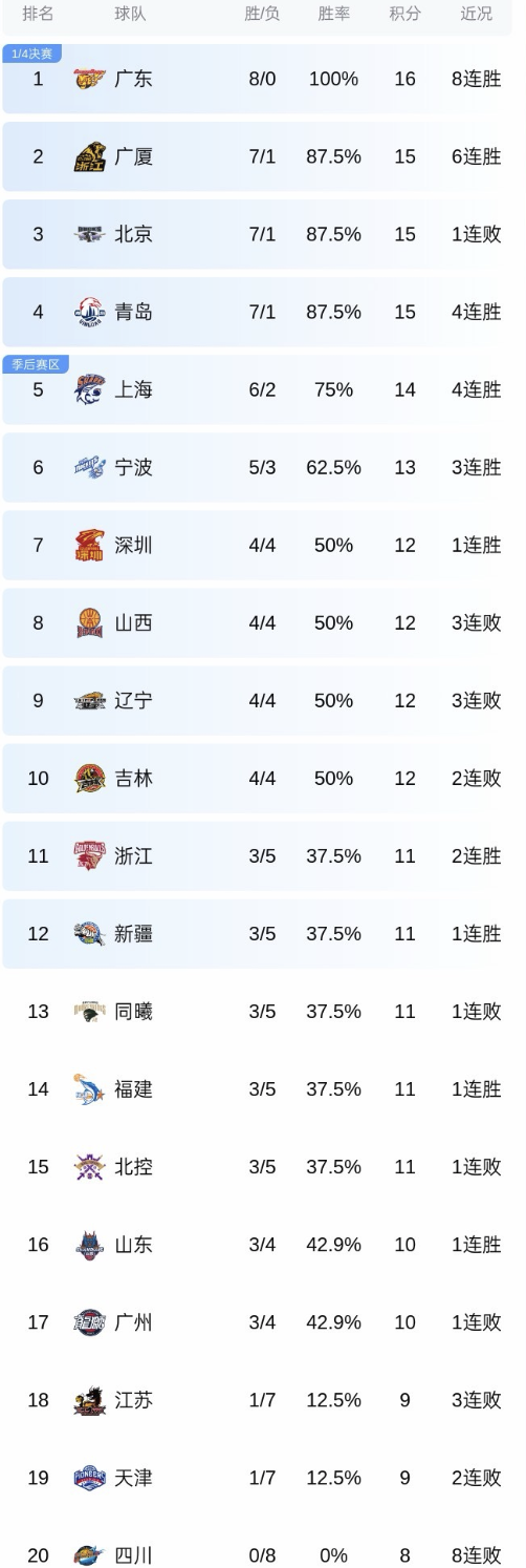随着新疆94-76大胜广州,广厦赢北京,广东8连胜,CBA积分榜更新