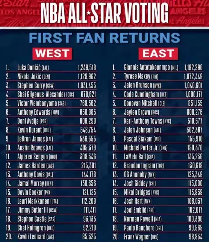 近日,NBA官方公布了全明星第一轮投票的结果,东契奇字母哥和约基奇领衔前三甲,虽然有多名球员突破100万选票,但杜兰特詹姆斯两位老将票选却是断崖式下滑。