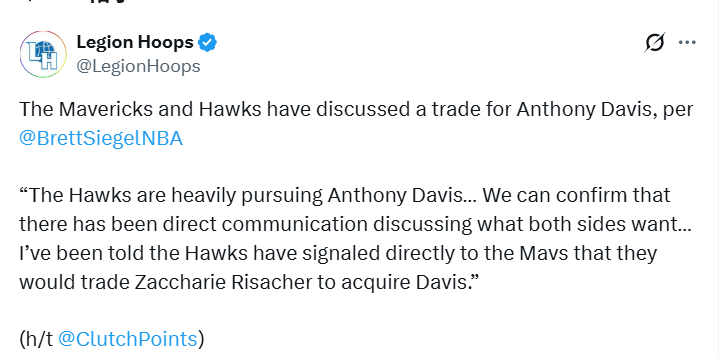 独行侠对交易戴维斯的想法同样十分开放。老鹰则已准备好与特雷-杨分道扬镳,且拥有里萨谢等筹码,足以向独行侠开出极具吸引力的报价。