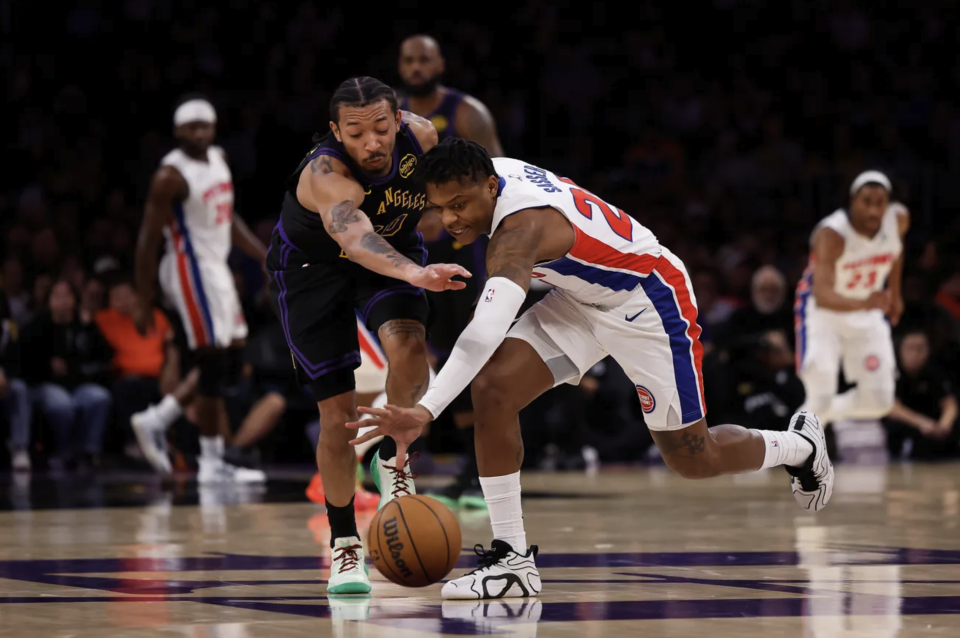 易边再战,艾顿空接暴扣,斯图尔特三分命中,东契奇和拉拉维亚连得5分,杜伦补扣得手。汤普森空切暴扣,詹姆斯上篮打进,杜伦后仰跳投,艾顿和东契奇连得5分,湖人扳平比分。坎宁安和霍兰连续突破得到6分,海斯上篮打进,东契奇和霍兰对飙三分,萨瑟2罚全中。艾维上篮打进,海斯补扣得分,艾维反手上篮。三节比赛结束,活塞96-88领先湖人。