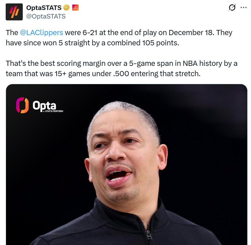 凭借这样的表现,快船队不仅拿下现存最长的5连胜,还成为NBA历史上50%胜率以下(至少15场)球队5连胜的净胜分新纪录,过去5场比赛快船队净胜105分。