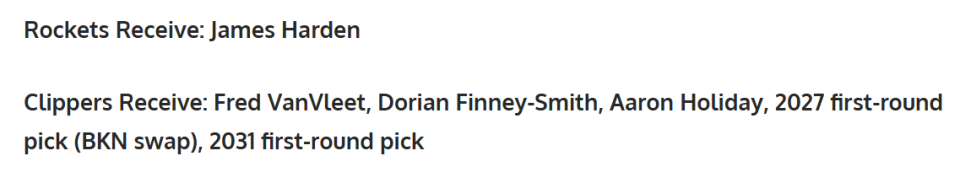 快船得到:范乔丹+芬尼史密斯+霍勒迪+27年首轮签+31年首轮。