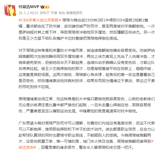 媒体人付政浩发文斥责广东男篮防守周琦使用武术动作。他表示,职业球员要恪守职业底线,不能砸别人饭碗。