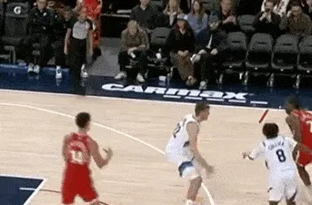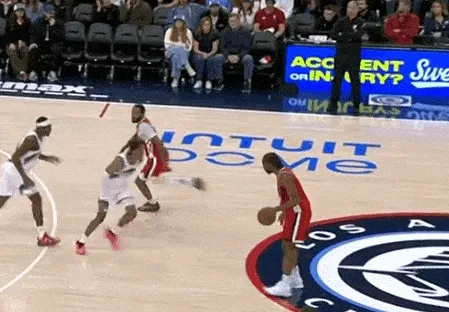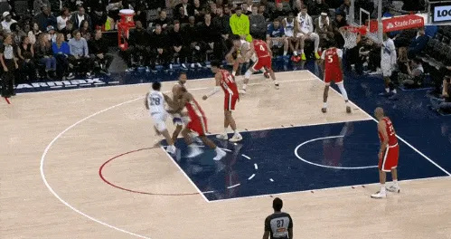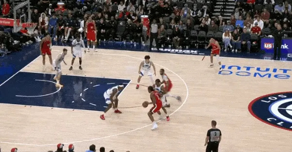 抓早期进攻,弧顶持球单打亨德里克斯:胯下攻击防守人前侧脚,随后再迅速衔接胯下配合后脚的“挖步”启动右路突破,行进间对抗接触的瞬间立即急停晃飞防守人,随即出手稍带后仰的中投。