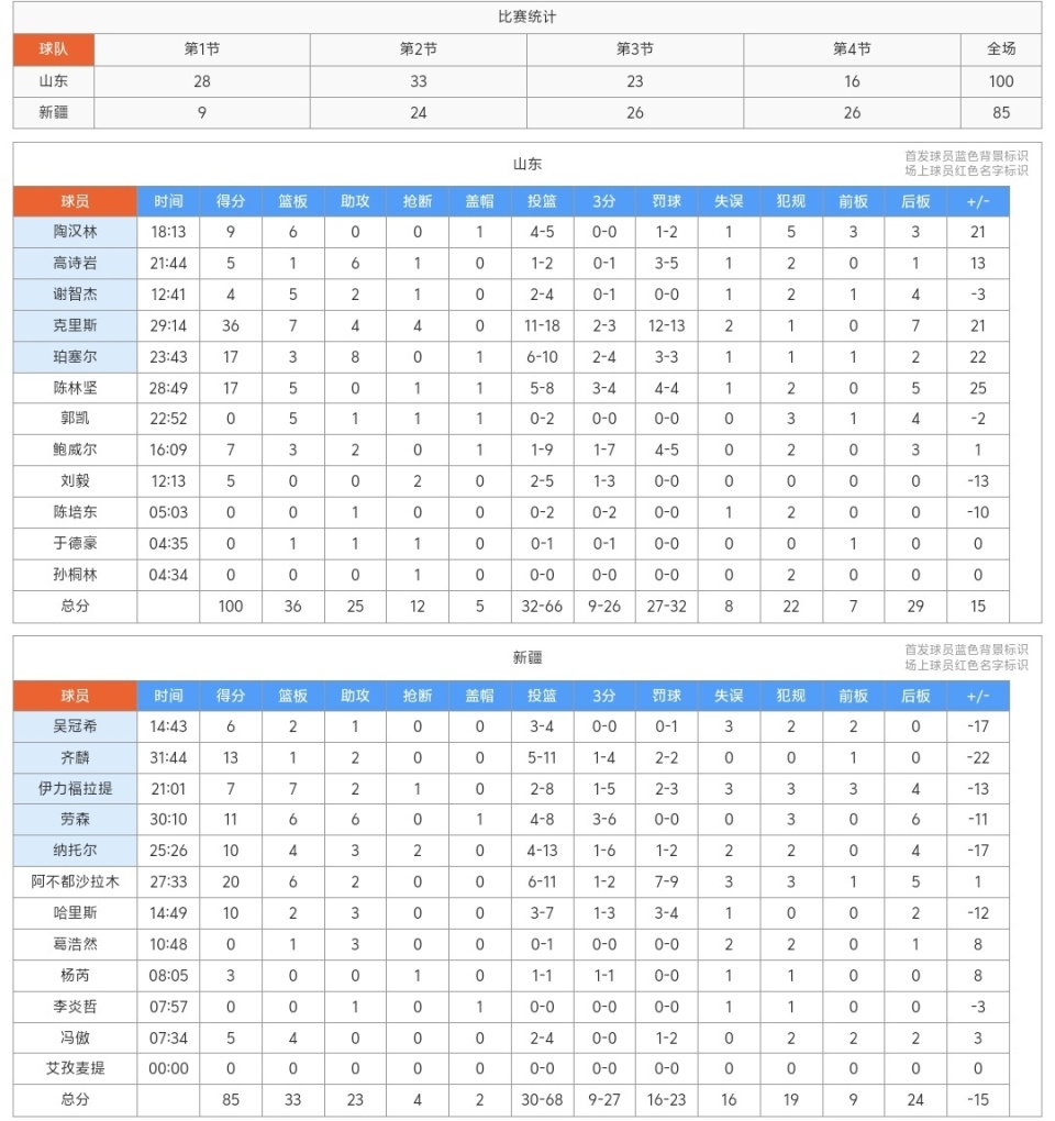 第二节新疆队的进攻好了一些,哈里斯连拿7分,其他人也都有得分进账,但是整体的效率还是偏低,山东队则是继续暴走,中场休息时,山东已经61-33领先,上半场山东队克里斯15+5+4、珀塞尔17+3+7、陈林坚9分、陶汉林9分,新疆队这边劳森、纳托尔、阿布都沙拉木都是3分,哈里斯9分,新疆落后太多了!