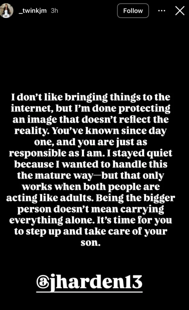 凯尔西-M写道:“我本不想把这种事闹到网上,但我再也不想为一个名不副实的形象买单了。从一开始你就知道真相,你和我一样负有责任。我一直保持沉默,是因为想以成熟的方式处理这件事,但这需要双方都拿出成年人的态度。隐忍不代表要独自承担一切。现在是时候站出来,承担起对儿子的责任了,@jharden13(哈登账号)。”