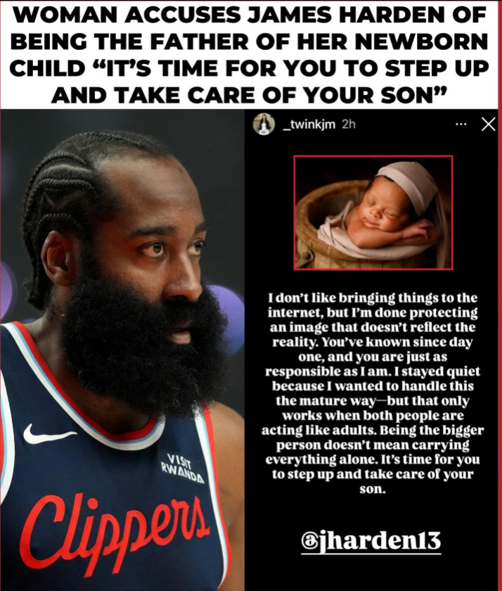 北京时间1月3日,一位网名为_twinkjm的女士在自己的社媒上对哈登公开喊话,要求哈登对他们俩的孩子负责。