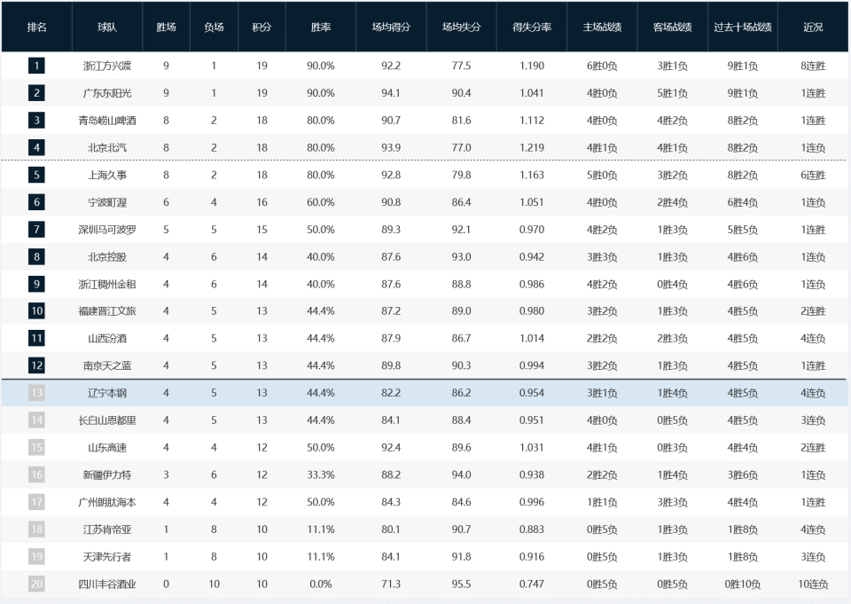 至此,广东男篮拒绝连败,拿到新赛季第9个胜场,总成绩改写为9胜1负。北控男篮综合战绩并不突出,本场过后改写为4胜6负,目前排名位居第八。